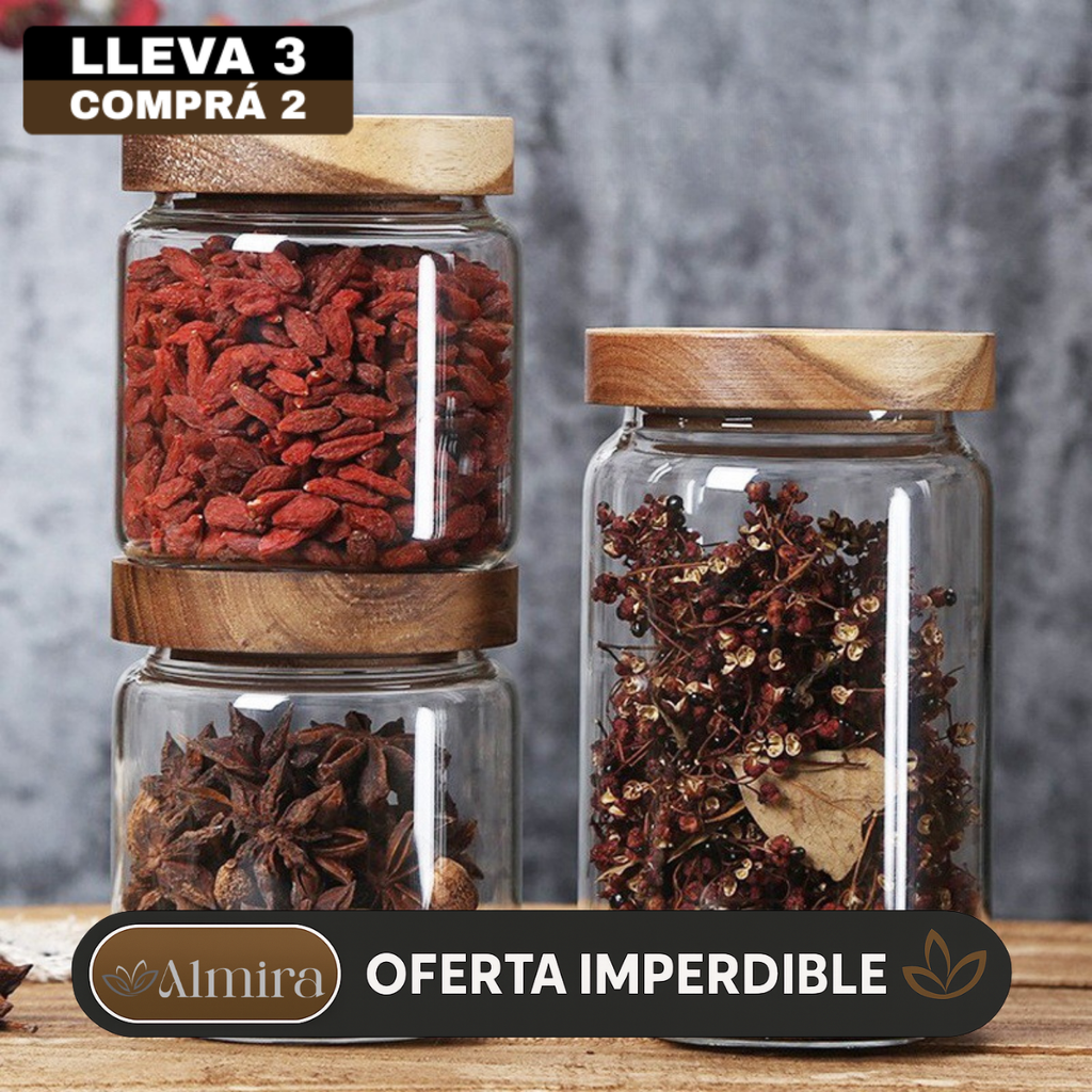 Cada pote está creado con vidrio de alta calidad y tapas de madera tratada, pensados para resistir el paso del tiempo. Nada de plásticos baratos: solo materiales nobles que acompañan tu día a día.